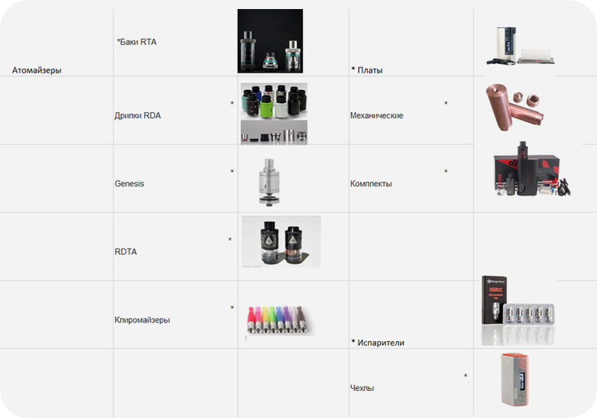 - Атомайзеры: Баки RTA, Дрипки RDA,  Genesis, RDTA, Клиромайзеры