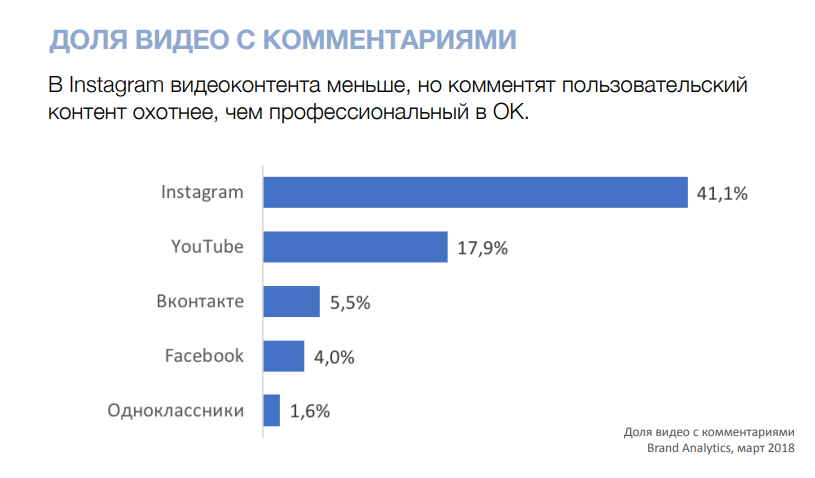 За прошедший год в данной социальной сети вырос объем просматриваемого видео (+ 40%), также вырос просмотр историй (+ 90 %), увеличилась и вовлеченной в комментариях (+ 20%). Комментарии — очень важная метрика, по которой больше ранжируется пост в ленте. Выросло и количество аккаунтов представителей малого и среднего бизнеса: во Вконтакте стало на 30% больше таких сообществ.