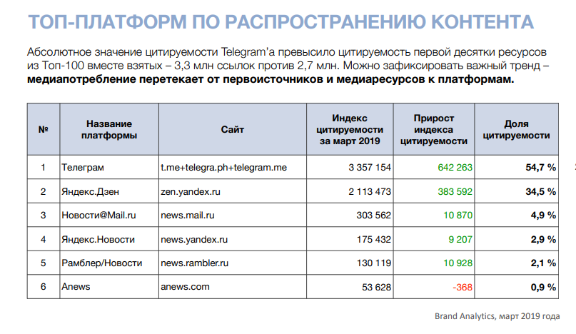 Годовщину блокировки Телеграм встречает как самая быстрорастущая платформа распространения русскоязычного контента. Индекс цитирования Телеграм вырос в марте по сравнению с январем 2019 года на 32%.