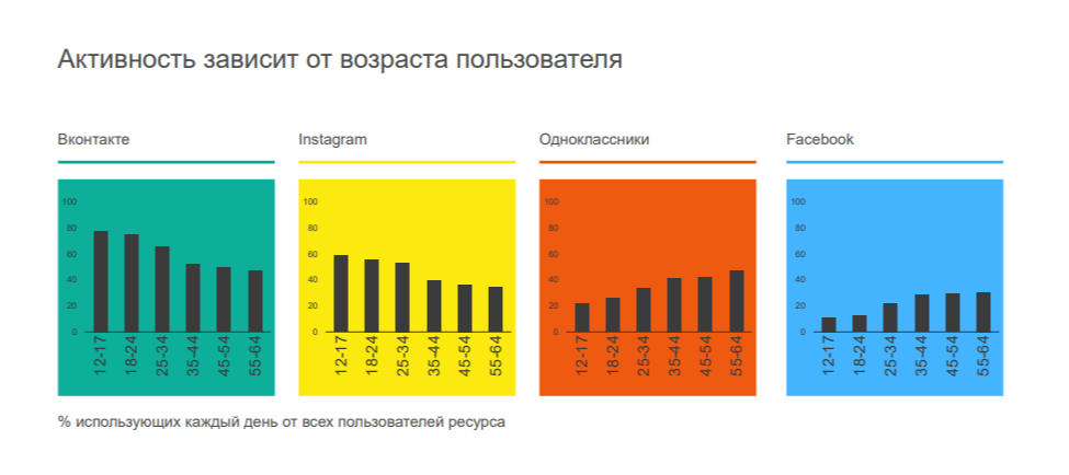 4. Взросление соцсетей. Это общий тренд для всех соцсетей, особенно для Фейсбука. Эта сеть приросла в основном за счет прихода пользователей старше 45 лет. Исключение из тренда – Твиттер, который молодая аудитория активно открывает для себя, и Одноклассники, предлагающие актуальный для молодежи контент.