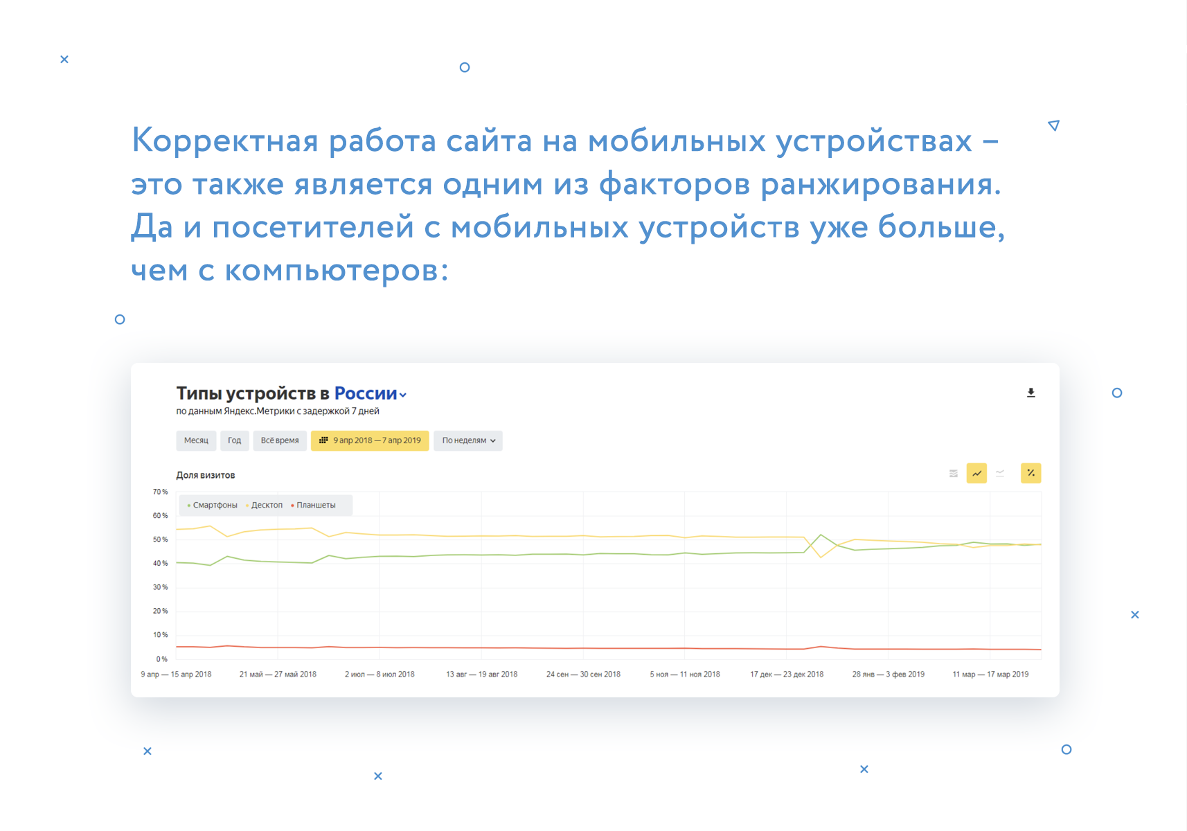 8. Корректная работа сайта на мобильных устройствах – это также является одним из факторов ранжирования. Да и посетителей с мобильных устройств уже больше, чем с компьютеров: