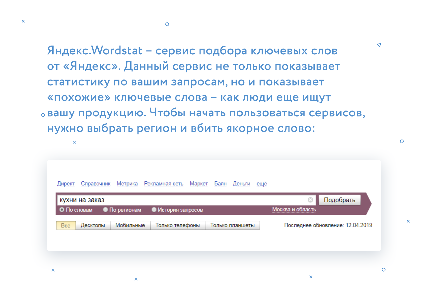 1. Яндекс.Wordstat – сервис подбора ключевых слов от «Яндекс». Данный сервис не только показывает статистику по вашим запросам, но и показывает «похожие» ключевые слова – как люди еще ищут вашу продукцию. Чтобы начать пользоваться сервисом, нужно выбрать регион и вбить якорное слово: