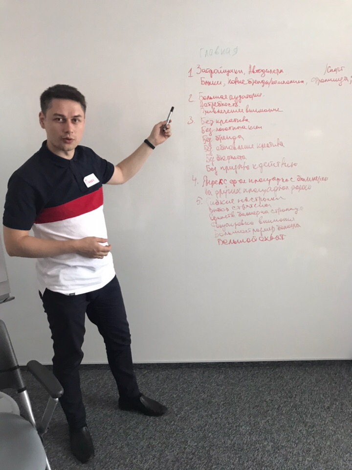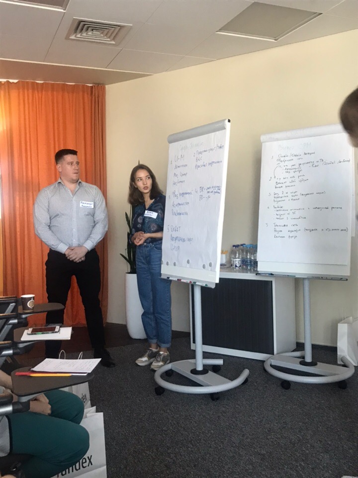 В практической части встречи участники разбились на команды и устроили "мозговой штурм". Задачей было определить преимущества того или иного инструмента Яндекса для конкретной отрасли. Такие уроки очень полезны для лучшего понимания продуктов Яндекса и умения подбирать подходящие из них для решения задач клиентов.