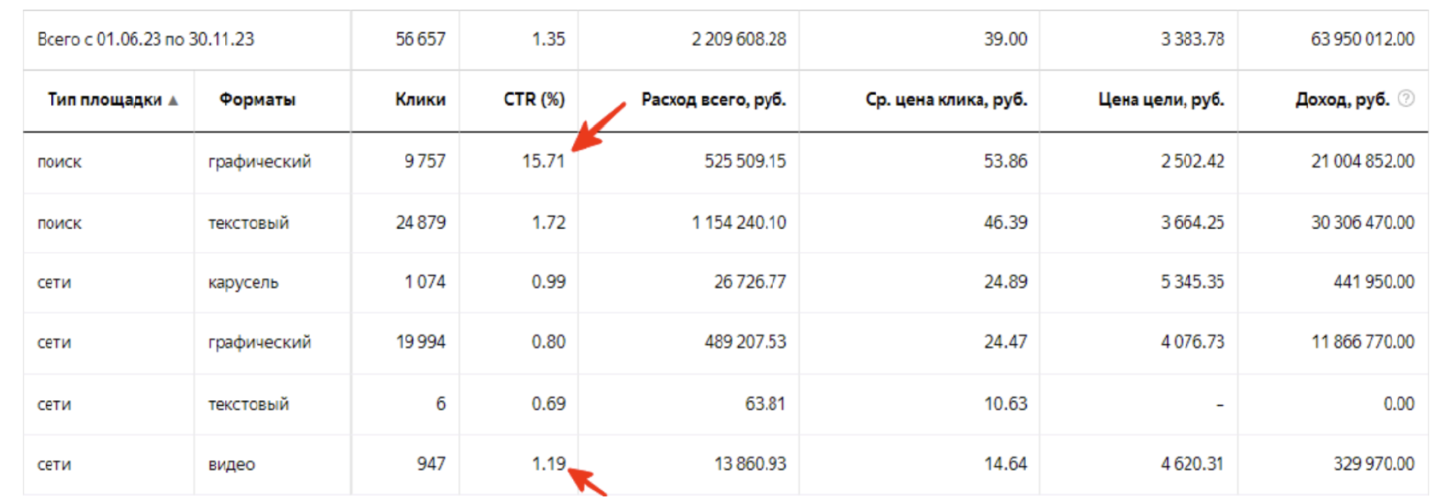 Так, доработанные объявления на Поиске и видео в РСЯ показывают высокий CTR. Потенциальный доход от этих форматов многократно превышает затраты.