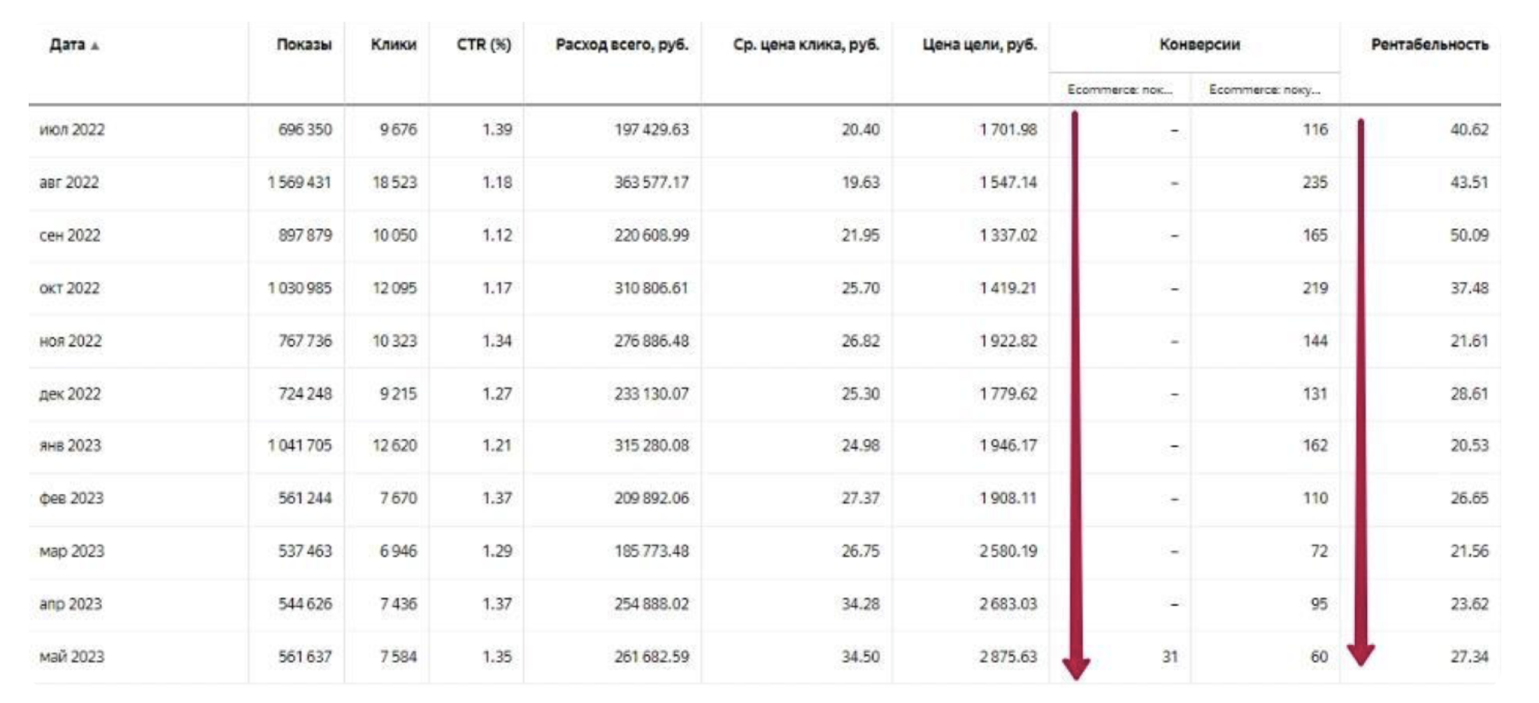 На скриншоте видно, как снижается количество конверсий, а цена цели растет