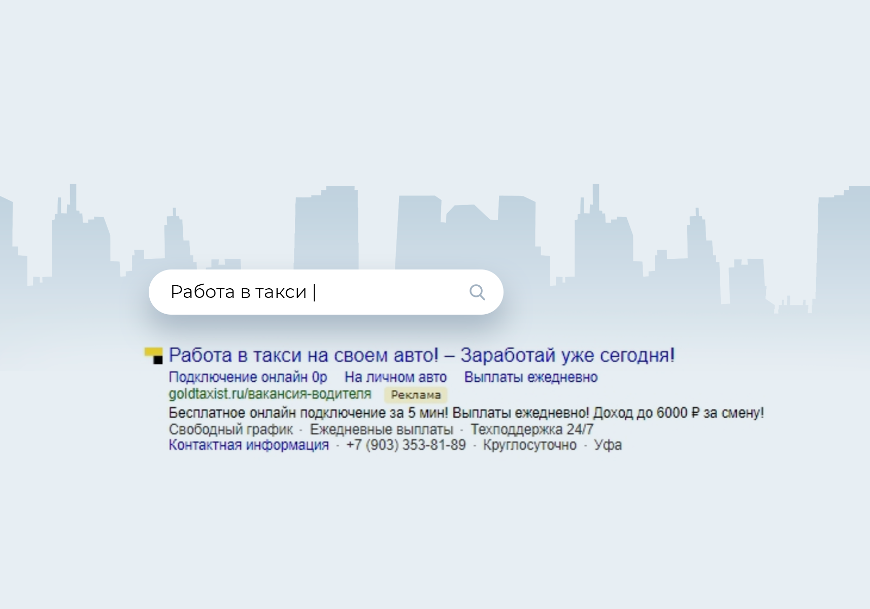 В тексте объявления на поиске содержатся ответы на вопросы ЦА: сколько зарабатывают таксисты, какой график, как подключиться к сервису