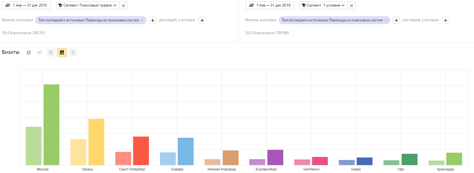 Ежемесячный органический трафик в концу 2019 года вырос более, чем в 2 раза по отношению к периоду прошлого года. Причем, количество пользователей с определенных городов пропорционально возросло во всех продвигаемых регионах поисковой выдачи.