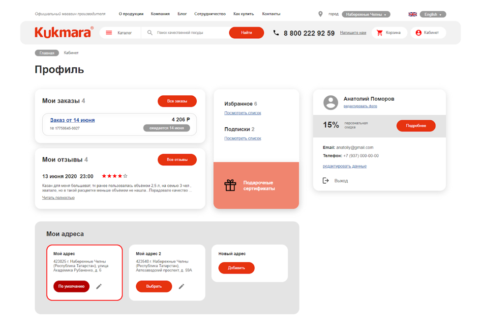 Перед нами стояла задача разработать современный интернет-магазин по продаже продукции российского бренда посуды «Кукмара». Текущая версия сайта устарела. Пользователю, по нашему мнению, не хватало комфортного взаимодействия с площадкой и гибкого личного кабинета.