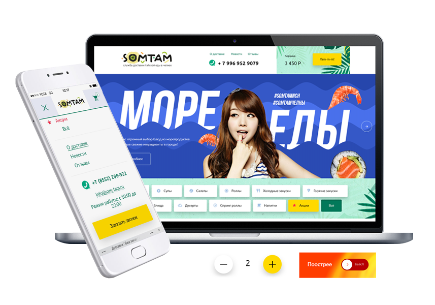 Создание сайта. Вдохновившись тайской кухней клиента и воспоминаниями об отпуске (а дело было зимой), мы очень захотели добавить ярких тропических акцентов на сайт. Основная цветовая гамма — солнце, пальмовые листья и море и песок.