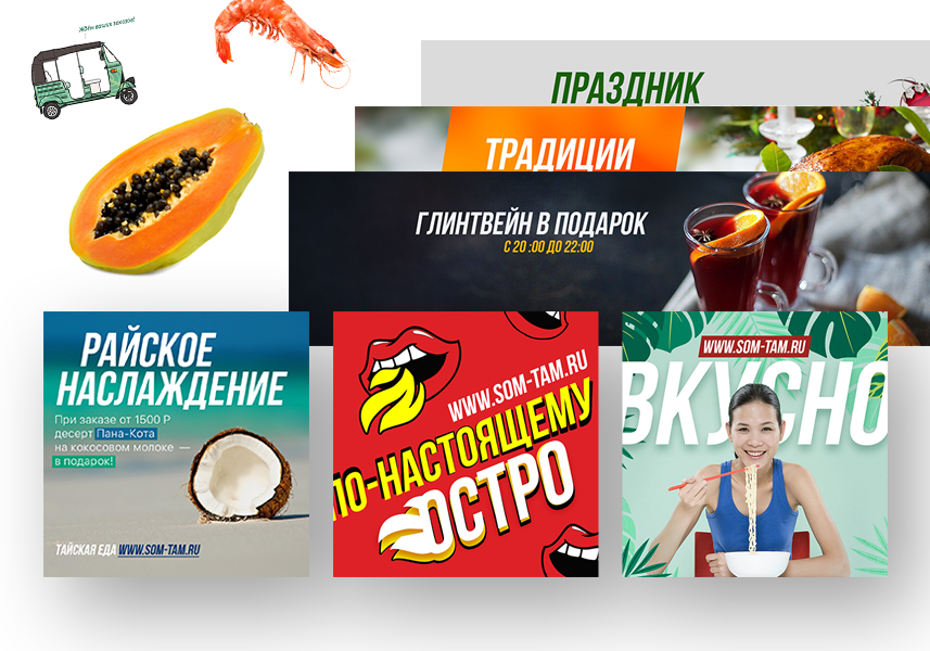 Создание фирменного стиля и наработки будущего сайта. Основную идею подсказал сам клиент. «Сом-там» — это салат из Папайи. Необходимо было создать узнаваемый чистый стиль, избежать излишнего хипстерства, пафоса и свести образ к максимальному упрощению, чтобы логотип можно было буквально нацарапать на песке.