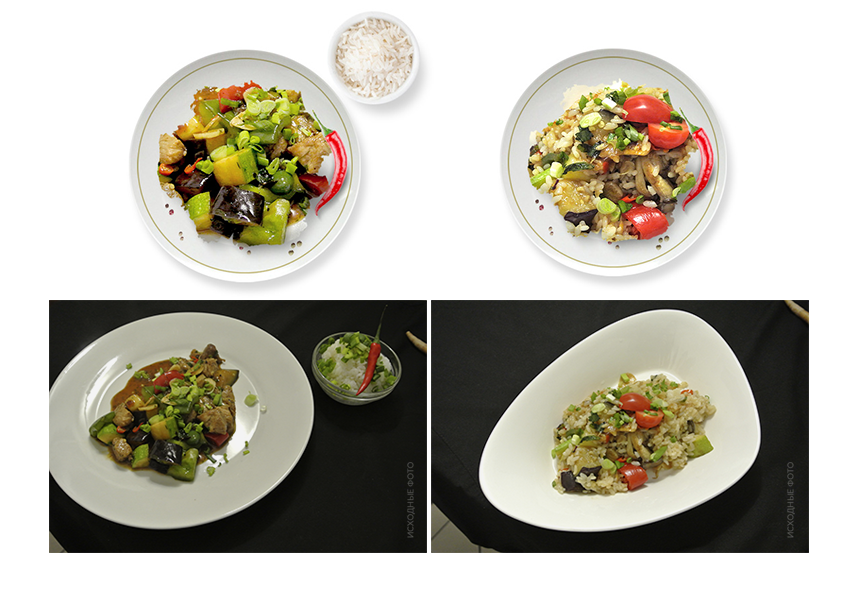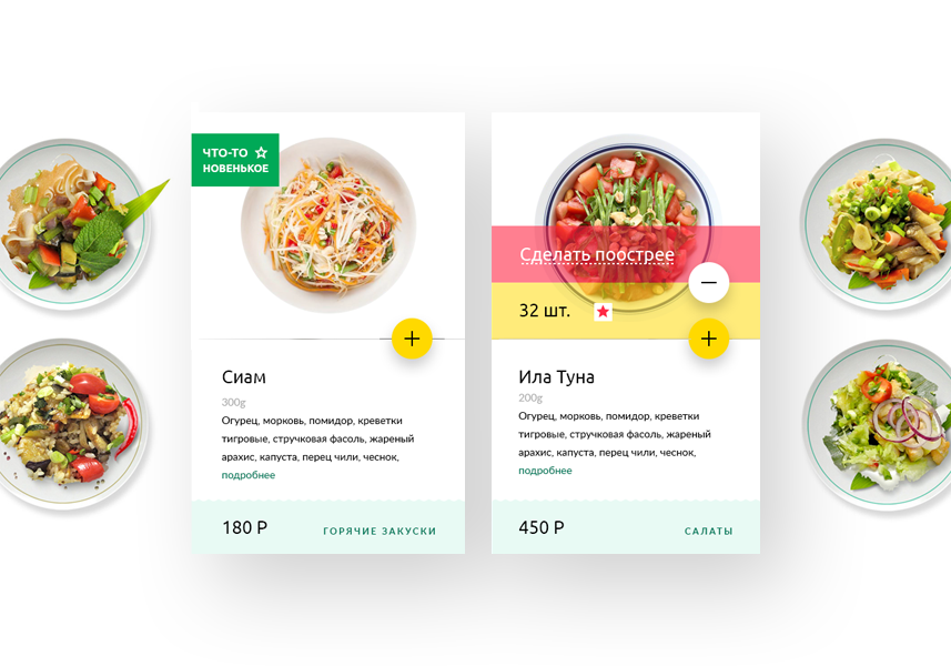До открытия оставалось мало времени, и съемка блюд пошла не по плану. Фотографии получились темными и не очень аппетитными, несмотря на то, что блюда были потрясающими. Сама тайская кухня изобилует соусами и приправами, и еда получается бурая. При съемке старались использовать декор и фрукты, но это не спасло снимки. Дизайнер принял решение привести изображения блюд на главной странице к единому виду при помощи фотомонтажа, а оригинальные фотографии оставить на внутренней странице блюда. Таким образом мы спасли главную страницу, но не обманули пользователя.