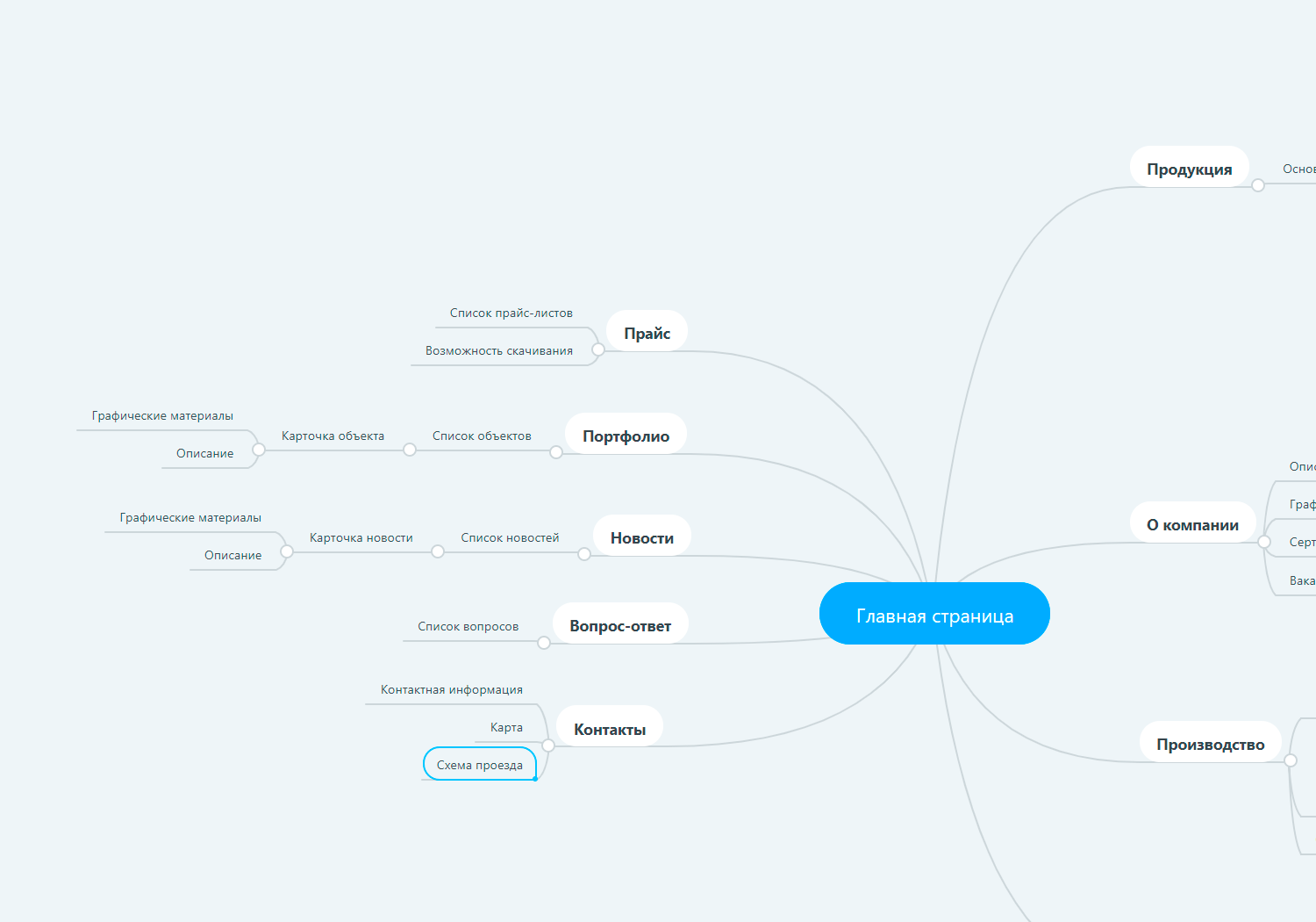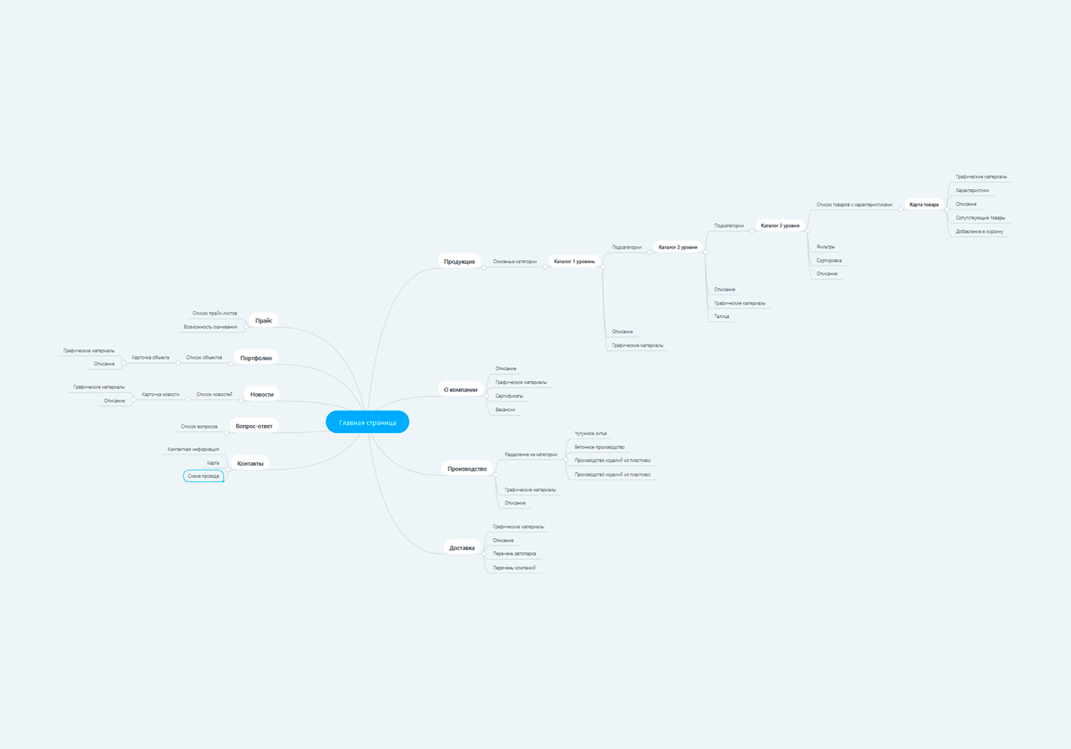 В формате Mind Map начинается аналитическая часть работы и идет разработка оптимальной структуры проекта. Здесь набрасываются мысли по будущим страницам, куда они будут вести, их функционал. Уже понятна логика, по которой будет работать проект.