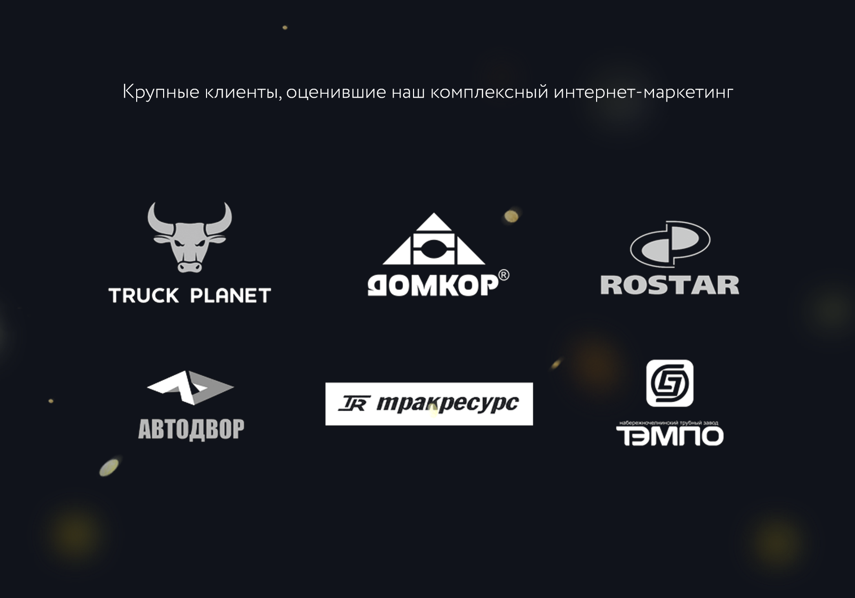 Нашей работой над комплексным интернет-маркетингом уже довольны такие клиенты, как ДОМКОР, РОСТАР, Десса, Автодвор, Тракресурс-Регион, Кукморский завод Металлопосуды, Трак Плэнет, Холдинговая компания ТЭМПО.