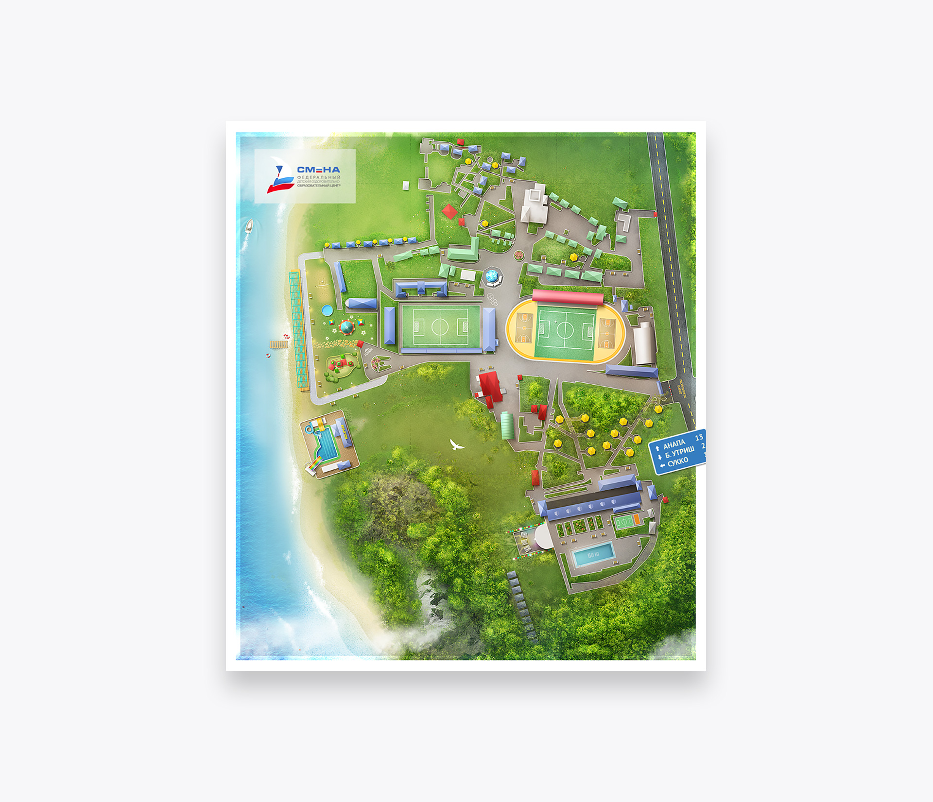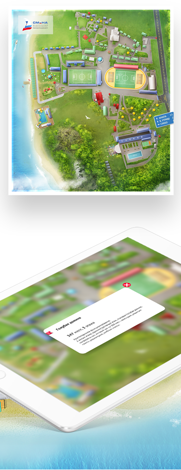 На основе предоставленных материалов  и снимков со спутника для сайта оздоровительного лагеря была разработана иллюстрация в виде навигационной интерактивной карты.