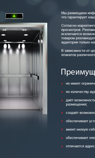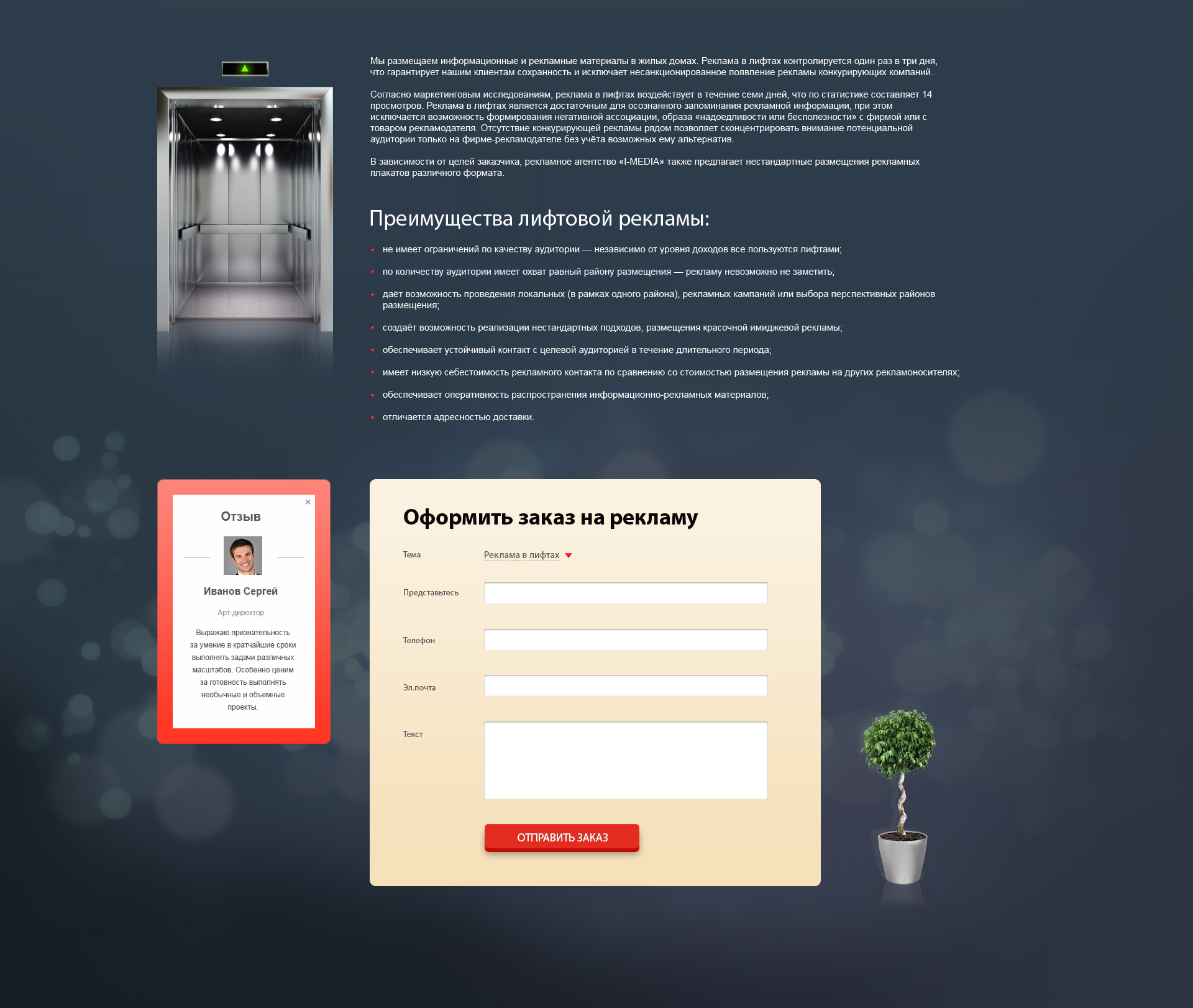 Рекламная компания I-Media предлагает в качестве рекламных носителей нетрадиционные площадки: реклама в лифтах, реклама на стендах, реклама на квитанциях.